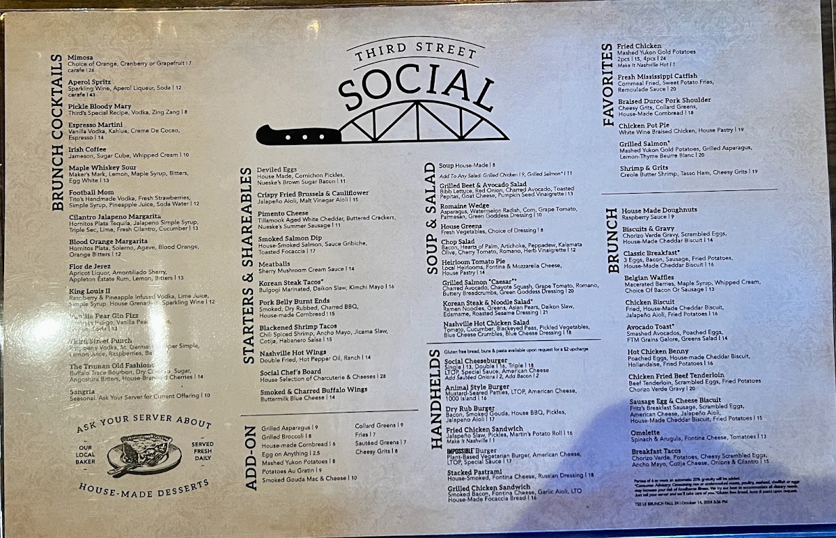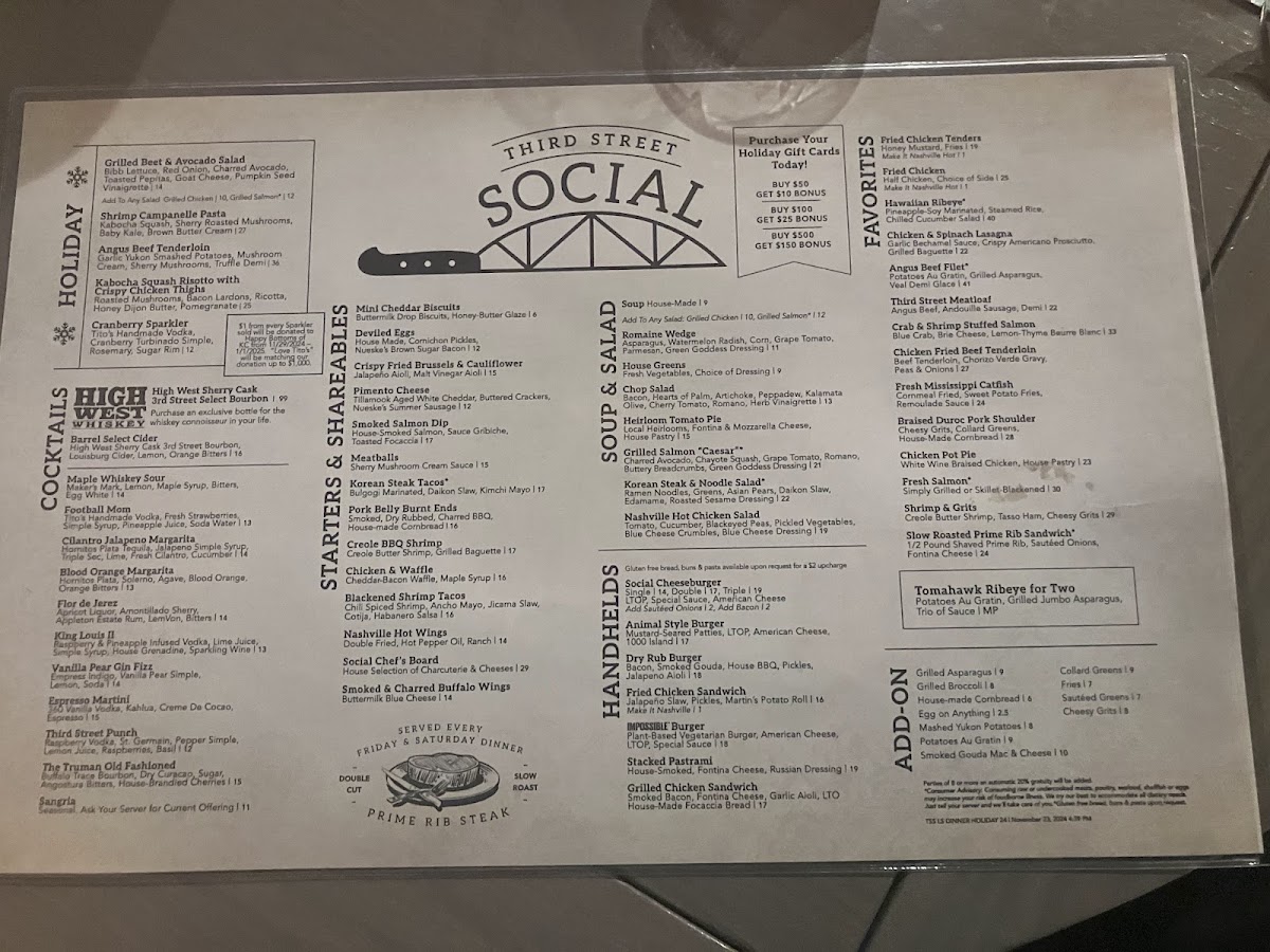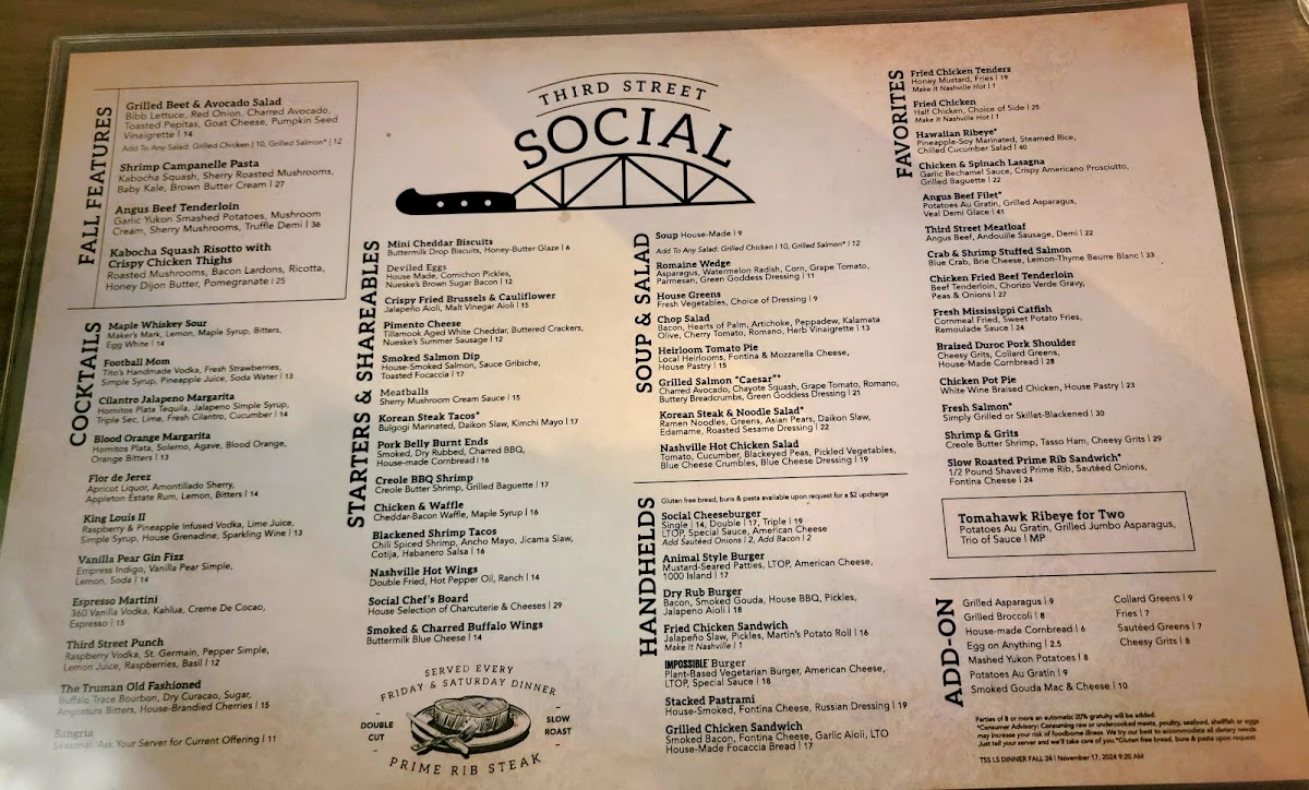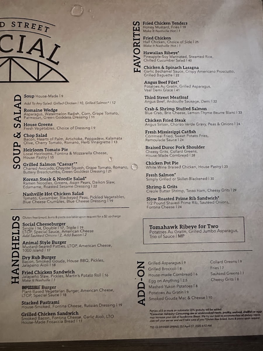 The menu at Third Street Social offers a blend of classic American dishes that will tantalize your taste buds. Among the standout favorites is the Chicken Pot Pie, featuring white wine-braised chicken enveloped in a flaky house pastry—comfort food at its finest for just $23.00. For seafood lovers, the Grilled Salmon is not to be missed, grilled to perfection and complemented by creamy mashed Yukon gold potatoes and grilled asparagus for only $24.15. If you're craving something fried, indulge in the Mississippi Catfish, served with sweet potato fries and a zesty remoulade sauce at $24.15. Don't overlook the Fried Chicken, which is a hearty half chicken accompanied by your choice of side for a mere $28.75.